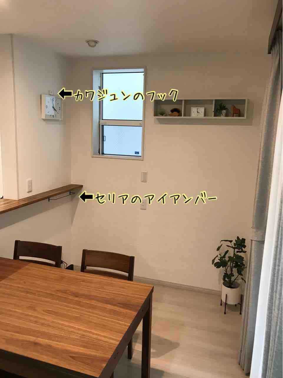 ハンガーや洗濯ピンチは毎回一階の洗面所から持って上がるのは面倒なので、ダイニングカウンターの下にセリアのアイアンバーをつけました!
