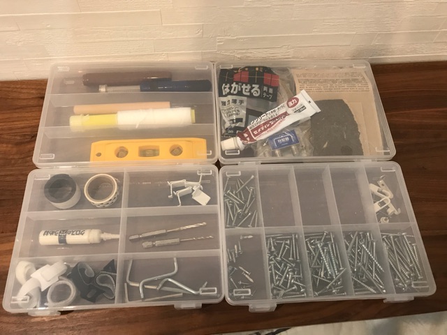 下地探し、水平器、ボンド、マステ、電動ドリルのビットなどなど、よく使う物を納めました!