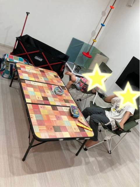 さらにさらにコールマンの机やら、クーラーボックスを買い早速お家キャンプごっこ😊